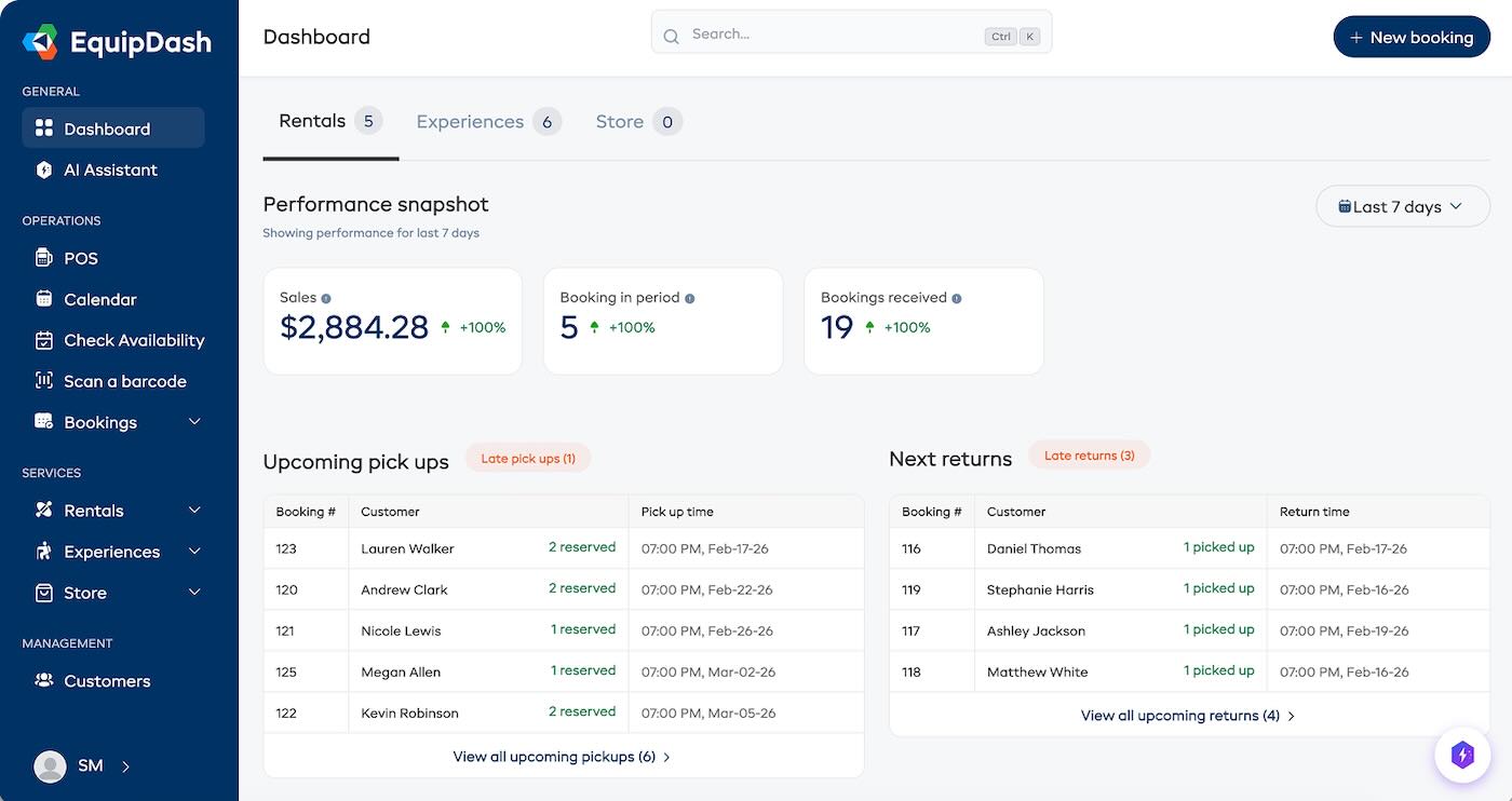 Contact UsEquipDash is an AI-powered booking and operations platform built for equipment rental shops and tour or experience operators. It brings bookings, inventory, staff scheduling, waivers, payments, and customer management into one dashboard — with Dash AI for natural-language operations and Dash Agents that run tasks autonomously across 100+ tools.